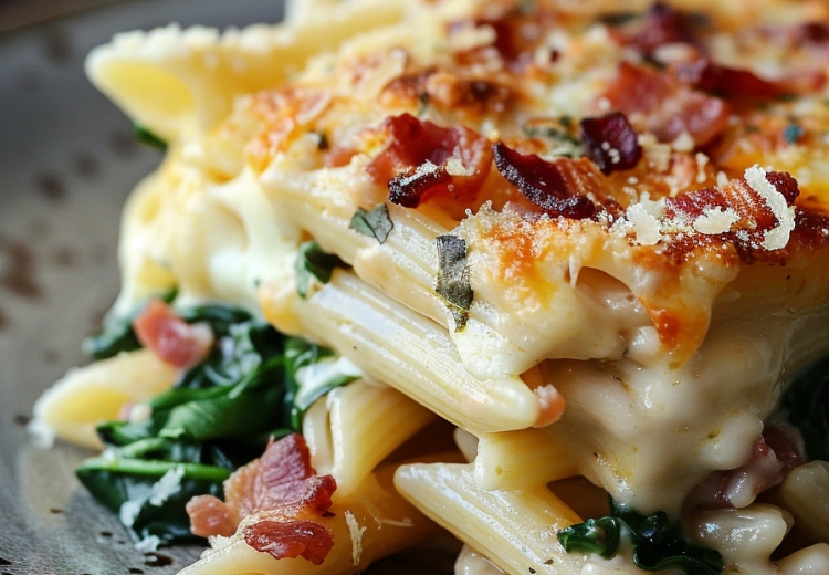Zapiekanka makaronowa z boczkiem, pieczarkami i szpinakiem to kremowe i sycące danie, idealne na obiad lub kolację. Deli...