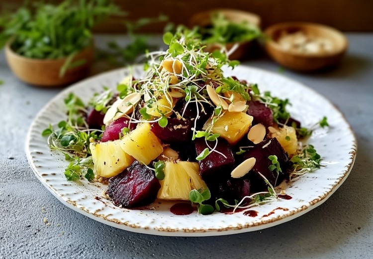 Sałatka szparagowa z dodatkiem świeżego ananasa, gotowanych buraków, kiełków i rzeżuchy posypana chrupiącymi migdałami w...