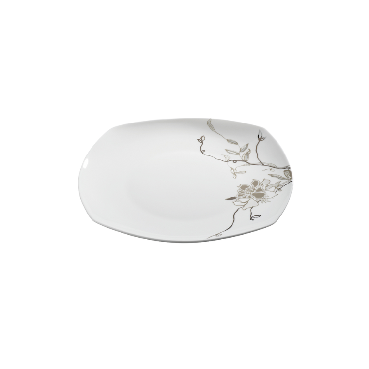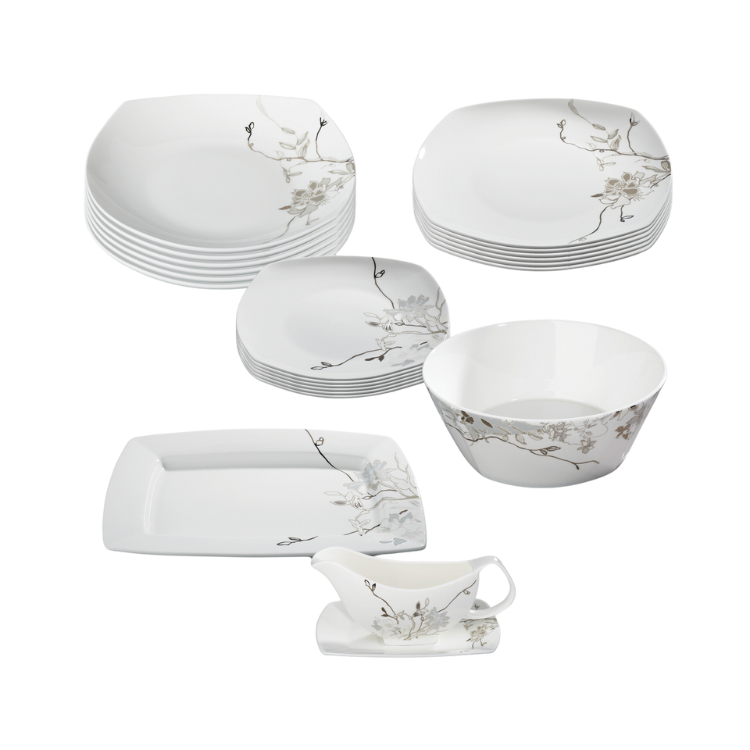 W skład serwisu obiadowego Fiore wchodzi: 6 dużych talerzy, 6 małych talerzy, 6 głębokich talerzy, półmisek, sosjerka z podstawką, salaterka.