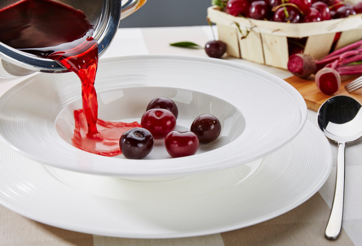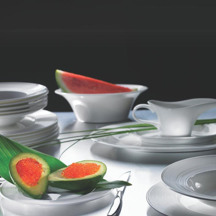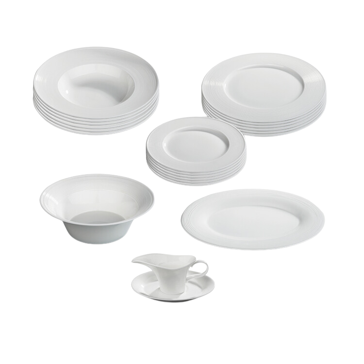W skład zastawy obiadowej Moderno wchodzi: 6 dużych talerzy, 6 małych talerzy, 6 głębokich talerzy, półmisek, sosjerka z podstawką, salaterka.