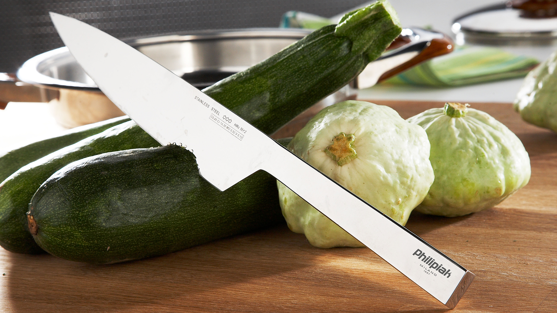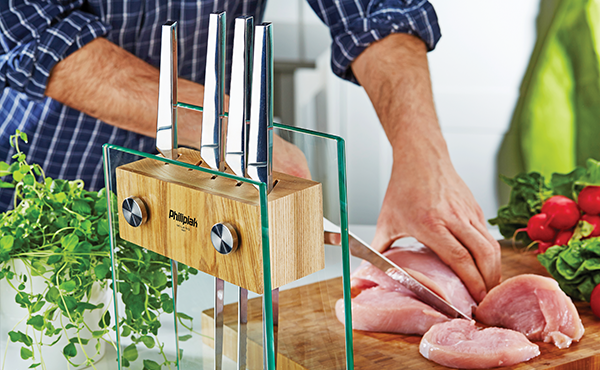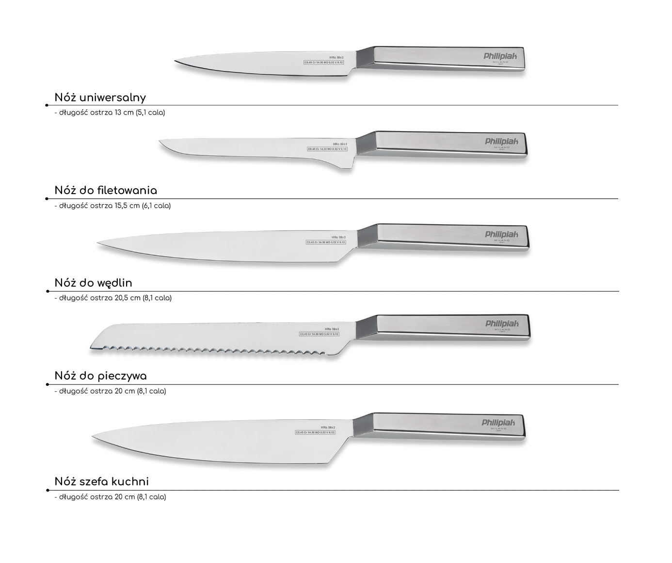 Noże Philipiak Milano wykonano z wysokiej jakości stali szlachetnej o twardości HRc 58. Dzięki zaawansowanym procesom technologicznym są bardzo ostre i trwałe. Nie wymagają częstego ostrzenia. Krojenie, siekanie i obieranie stają się czynnościami łatwymi i przyjemnymi. Uchwyty noży zaprojektowano zgodnie z nowymi trendami w designie. Są wygodne w użyciu, a ich profil i kształt doskonale pasują do nowoczesnych kuchni. Elegancki stojak na noże z hartowanego szkła i drewna, wyposażony został w dopasowane komory. Zapewnia to wygodę w przechowywaniu noży. Cały zestaw nadaje kuchennym wnętrzom prestiżu i blasku.
