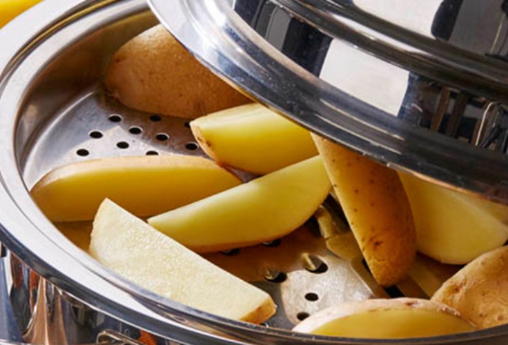 - Mała wieża – średnie naczynie przykryj misą (w zależności od potrzeb wewnątrz umieść lub nie tarkę). Na misie postaw małe naczynie z wcześniej podgrzanym dnem i przykryj pokrywą.
