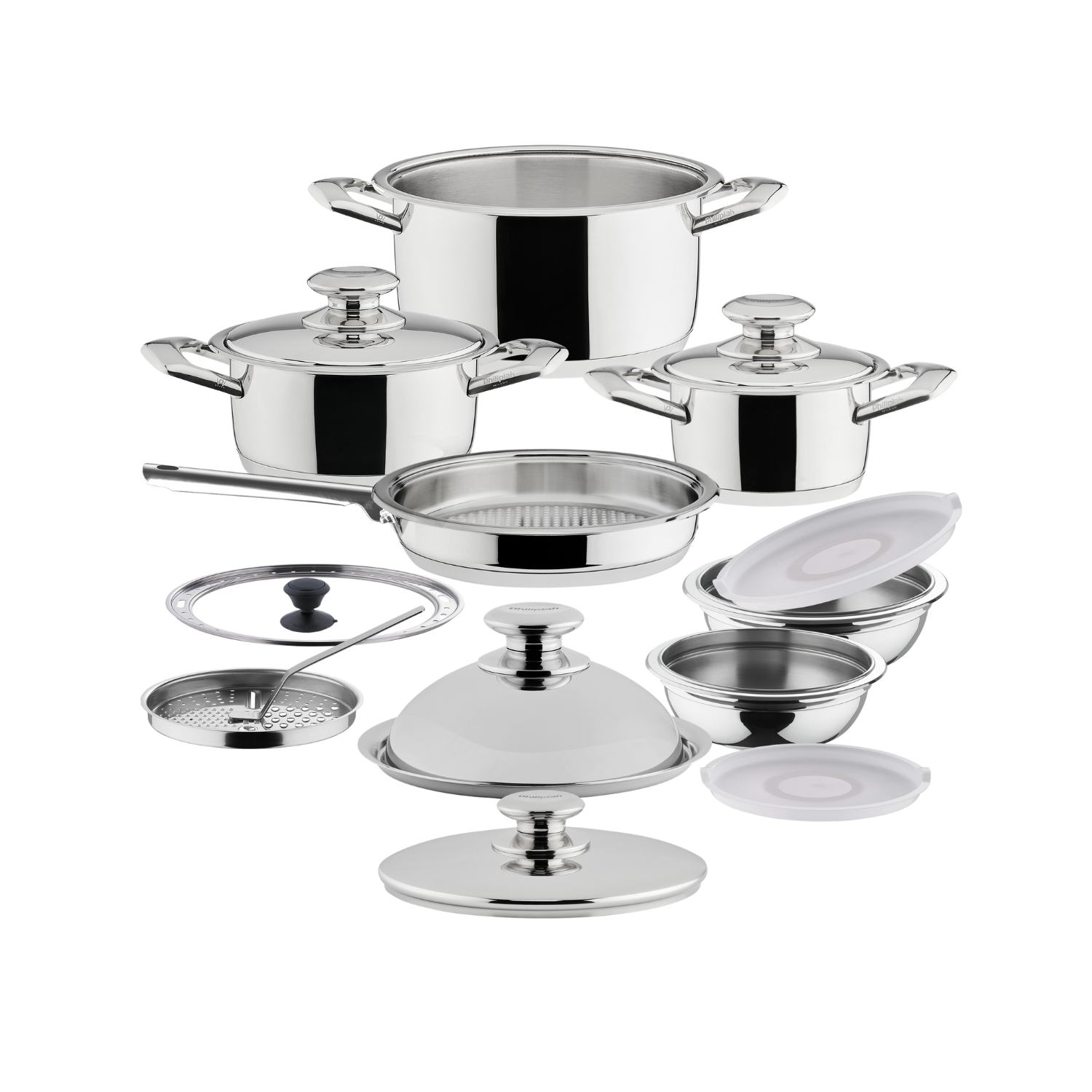 | Skład | garnek 5,2 l z pokrywa, garnek 3,5 l z pokrywa 20 cm, garnek 1,6 l z pokrywa 16 cm, patelnia groszkowa z pokrywą kulistą 24 cm, 2 misy z pokrywami, tarka, łopatka, krążek redukcyjny, przyssawka |