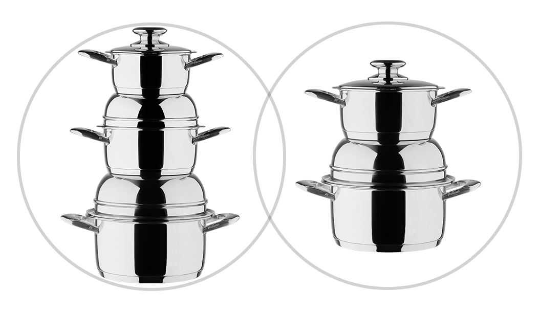 - Duża wieża – duże naczyne przykryj misą (w zależności od potrzeb wewnątrz umieść lub nie tarkę i pierścień redukcyjny). Na misie ustaw średnie naczynie, które przykryj misą małą. Na niej połóż małe naczynie z pokrywą.